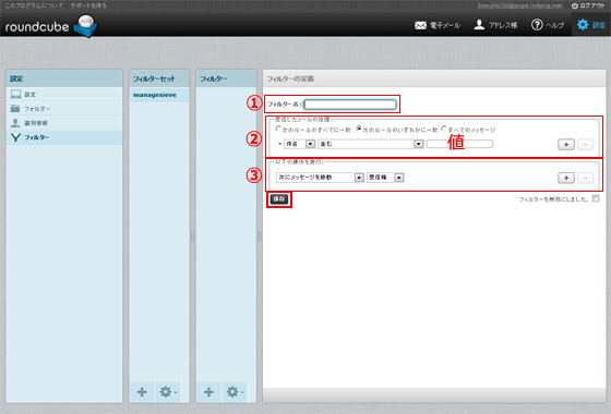 「フィルターセット」の欄に「managesieve」というセットがあります。通常はこのセットの中にフィルターを作成していきます。