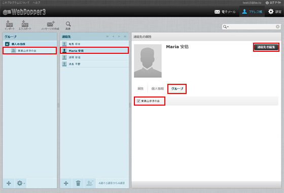 グループに所属させたい連絡先を選択し、「連絡先の属性」 で 「グループ」 をクリックします。