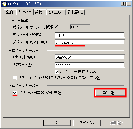 送信メールサーバー欄の「このサーバーは認証が必要」にチェックを入れ、「設定」ボタンをクリックします。